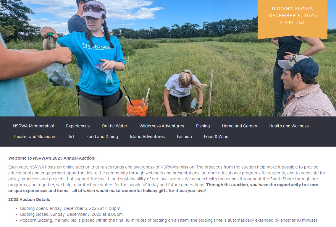 Score unique items and experiences offered by area businesses, artisans and organizations while supporting NSRWA! Proceeds from our annual auction help make our work possible, so please join us in bidding on your favorite items. Mark your calendar for this fun online event and look for preview notices soon!