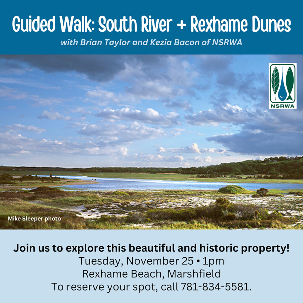 On November 25th, Brian Taylor and Kezia Bacon will offer a guided walk along the South River at Rexhame Beach in Marshfield. Now that you’ve learned about the river’s history, come see where some of the most significant events took place, including the Portland Gale! (Rain date December 2.)