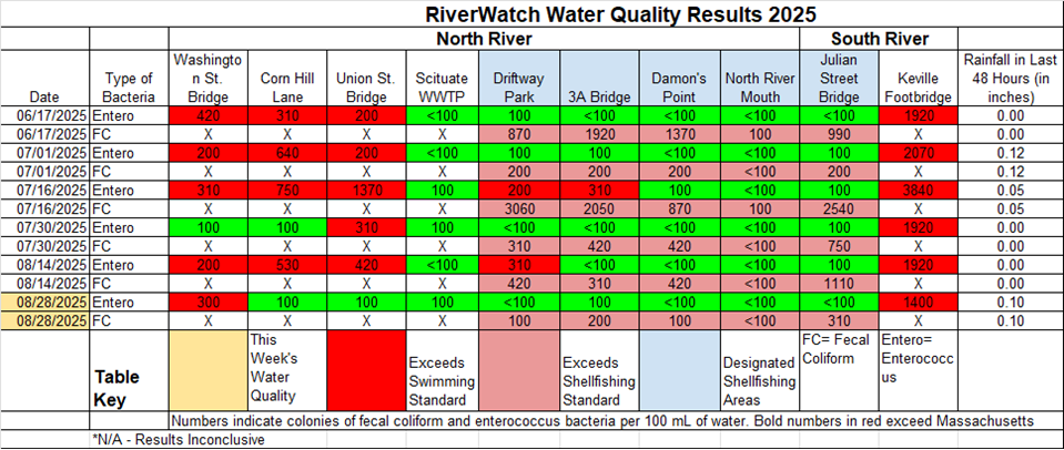 On Thursday, August 28th, we conducted RiverWatch Water Quality Monitoring at 10 long-term monitoring sites on the North and South Rivers with citizen science volunteers. This year, we will be reporting our biweekly water quality results on this Water Quality Monitoring web page. We share this data with the public with a few important caveats; we are not a regulatory agency and these data are only a snapshot of the water quality at the time they were taken, which was several days ago. Rain and other polluting events can impact the quality of the water at any time. For example, please take note that these results represent conditions on 8/28 prior to short-lived but heavy rain events on 8/29.