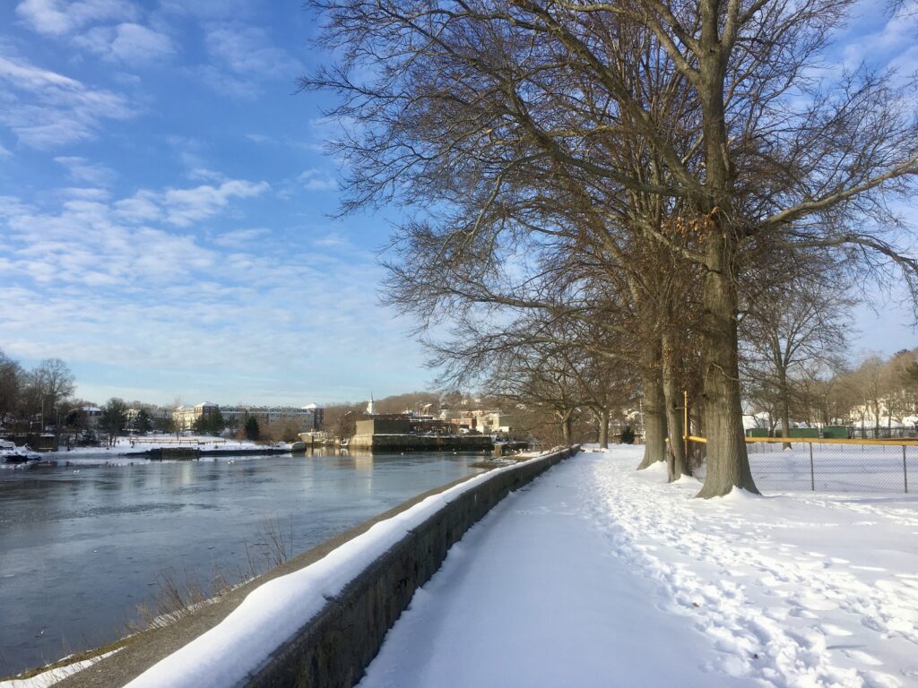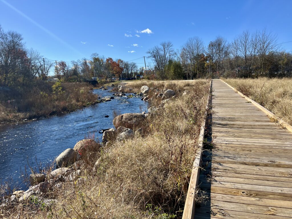 This ADA-compliant, 0.33-mile trail and boardwalk extends along the river, past the sites of the former Armstrong and Ames Dams, to the picturesque Rock Falls. A platform offers views of the fish ladder. Stop by in the mid-to-late spring and look for herring! Ample parking at Armstrong Park, at the corner of Plain at Hancock Streets.