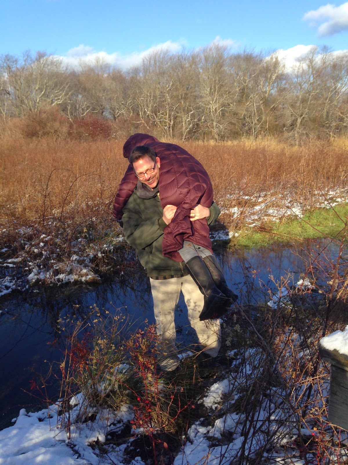 Ted O’Callahan helps his wife, Kim Hubbard, through one of the preserve’s wetter areas. |