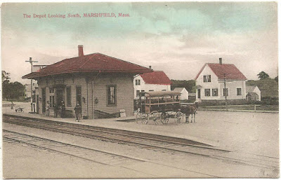 | Center Marshfield Station, which was located on the north side of Ferry Street, the location of the current (unmarked) parking area for the Bridle Trail. |