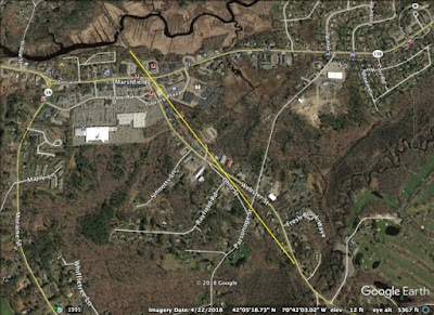 This map from Google Earth image shows the railroad bed in relation to Webster Street, as they exist today. (The railroad bed is yellow, with the South River at the top (north) of the photo, and the Green Harbor River at the bottom/south.)
