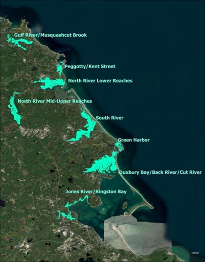 Eight key marsh complexes were assessed through a combination of field surveys, sediment monitoring, and GIS-based analysis. These sites span diverse geomorphological, hydrological, and land-use conditions, from the extensive Duxbury Bay marshes to smaller suburban marsh units like Green Harbor and Peggotty/Kent Street. Analytical methods included vegetation transects, sediment trap deployments, elevation and resilience modeling, unvegetated-to-vegetated ratios, and sea-level rise simulations to predict future marsh migration potential.
