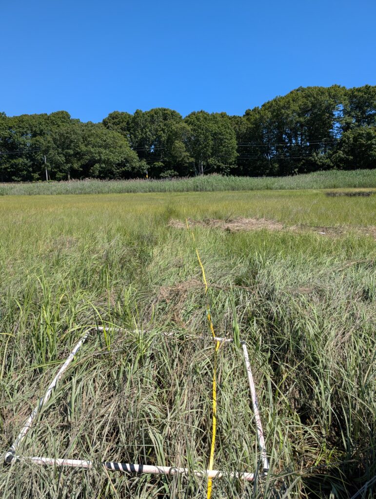 After finding the start point we laid out 300 meter long measuring tapes to establish our transects. Along this transect we conducted two types of measurements: 1) Quadrat surveys allowed us to estimate the percent cover of vegetation on the marsh and the various plant species present. 2) Belt surveys measure the width (distance) that different vegetation types make up across the marsh. The vegetation types, and species present, help determine the function and health of various parts of the marsh. The quadrat and belt surveys were conducted along the full width of the marsh, from the upland wooded edge to the river.