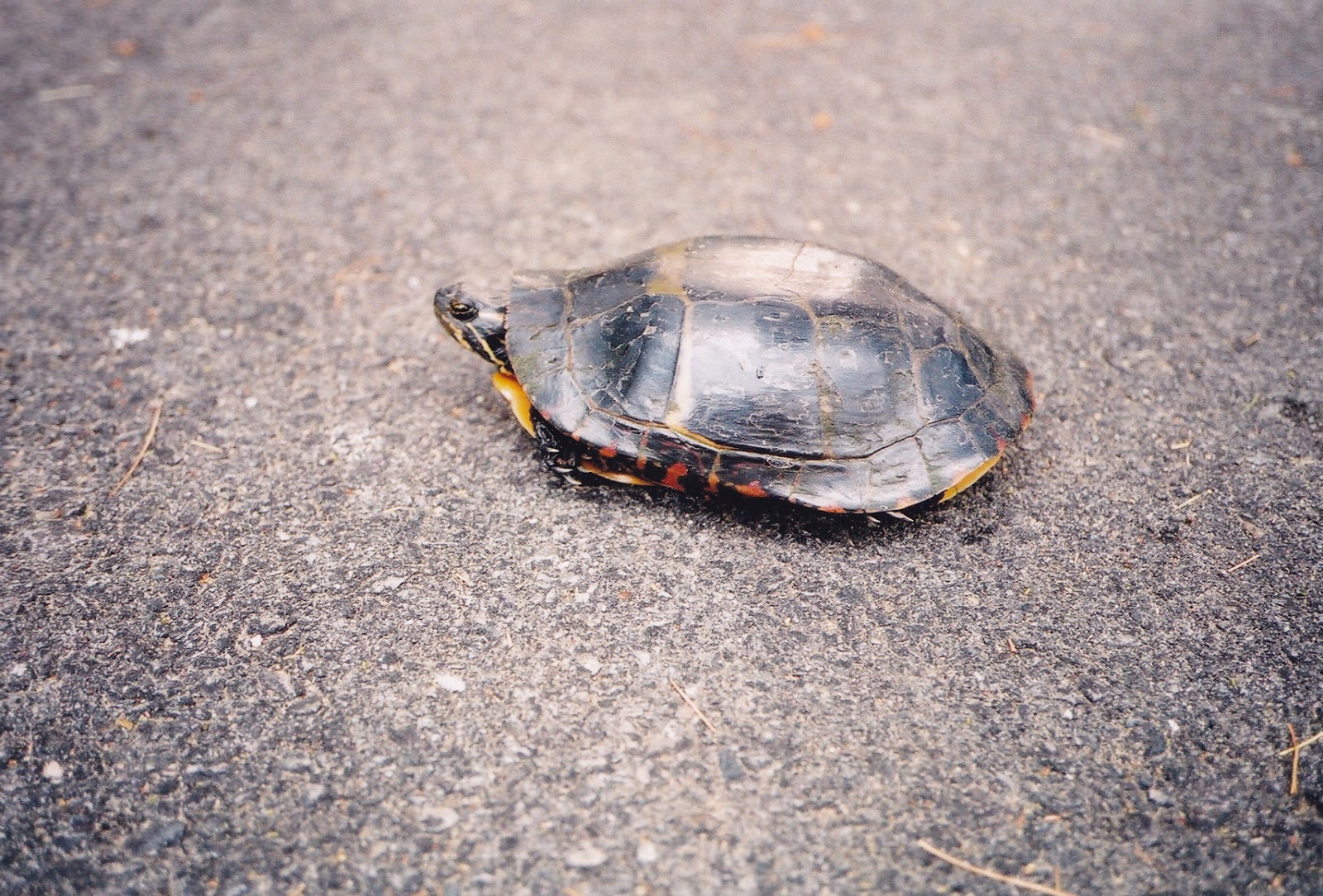 It happens every spring. I am driving down the road late in the afternoon and I see a small dark object ahead of me, right in the middle of my lane. As I approach, I note that the object is moving, ever-so-slowly, toward the side of the road. In order to pass around it, I must stop and wait for a break in the oncoming traffic. Thus every spring I spend a few seconds — maybe even a minute if the traffic is heavy — observing the female turtle en route to her nesting site.